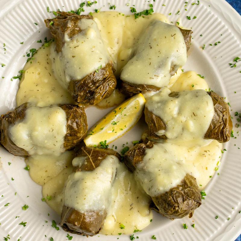 Freshly wrapped grape leaves stuffed with rice, ground steak and pure lamb that we prepare ourselves, and finely cut vegetables spiced to perfection and topped with our famous Lemon Dill sauce!