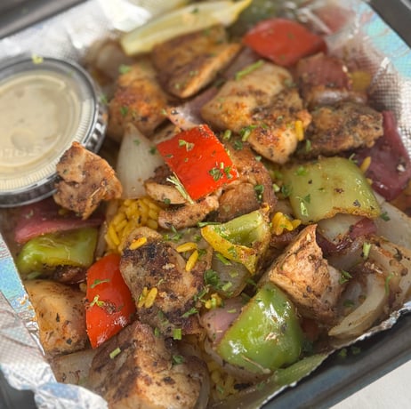 Grilled chunks of chicken with carmalized vegetables and Greek rice.