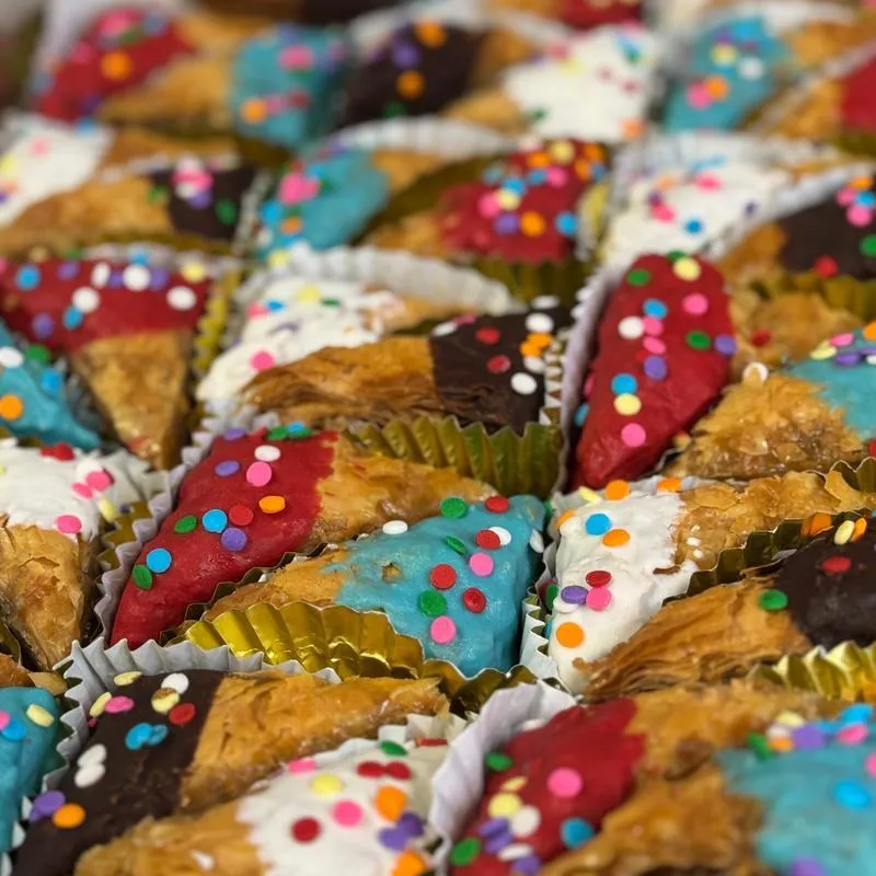 Medium sized baklavas colorfully dipped in chocolate and topped with sprinkles! Perfect to brighten up any occasion!